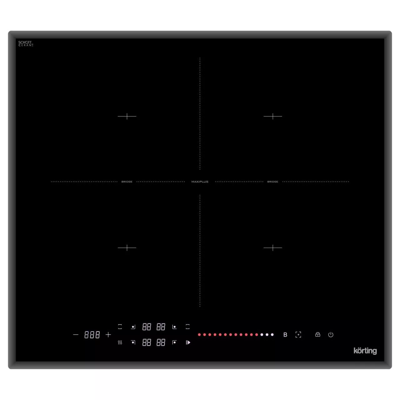 Индукционная варочная панель Korting HIB 64940 B Maxi выполнена из черной стеклокерамики и оснащена сенсорным управлением. 4 стандартных конфорки, а также функции объедения зон Bridge и MaxiPlus создают неограниченные возможности для приготовления пищи. При использовании функции «Stop&Go» модель запоминает все рабочие настройки и переводит их в режим поддержания тепла.