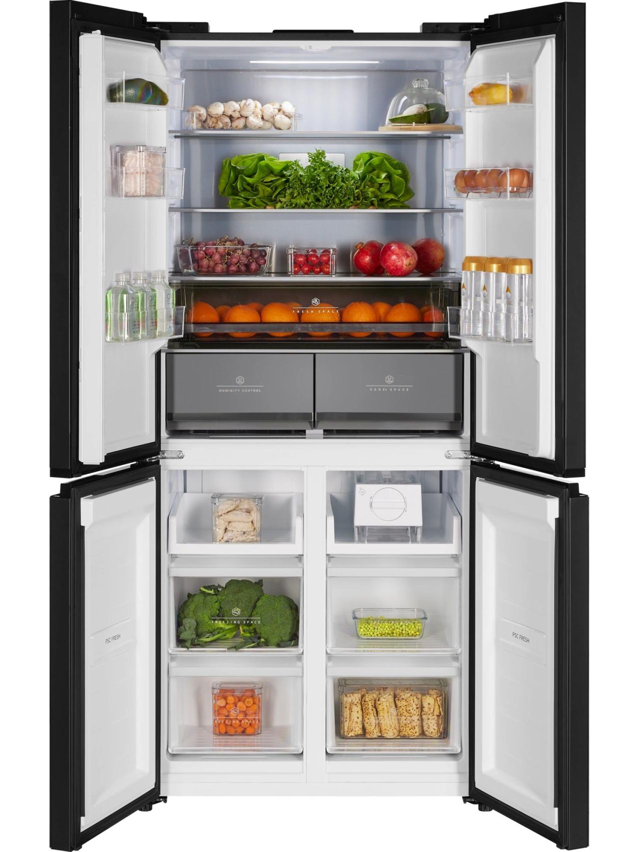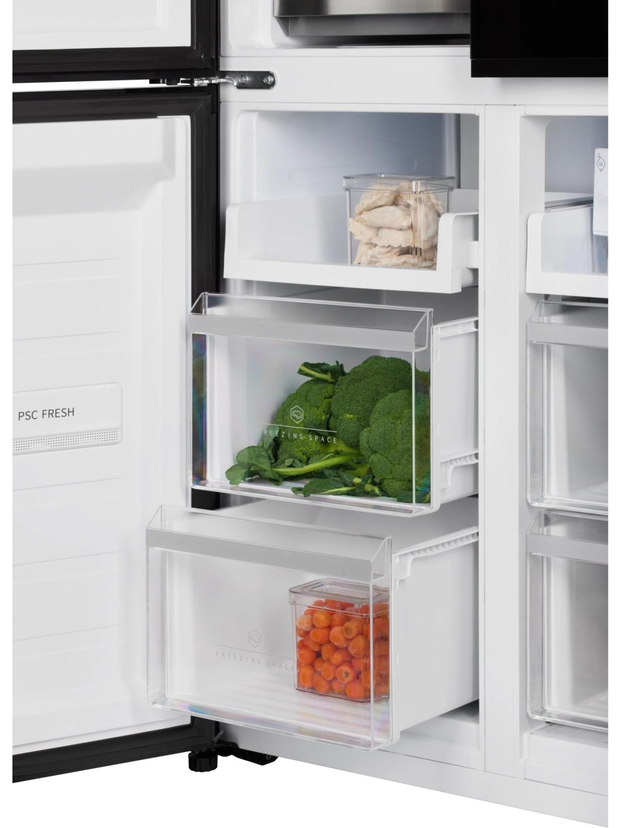 Холодильник HIBERG i-RFQ 630G B – изысканный представитель бренда. Эффектный черный фасад из закаленного стекла станет украшением любого кухонного и столового интерьера.Усовершенствованная конструкция отдельно стоящей модели и глубина 60 см позволят при необходимости гармонично интегрировать холодильник в мебельный гарнитур: достаточно всего 3 мм свободного пространства по бокам. А угол открытия двери в 90 градусов не препятствует полному выдвижению ящиков.