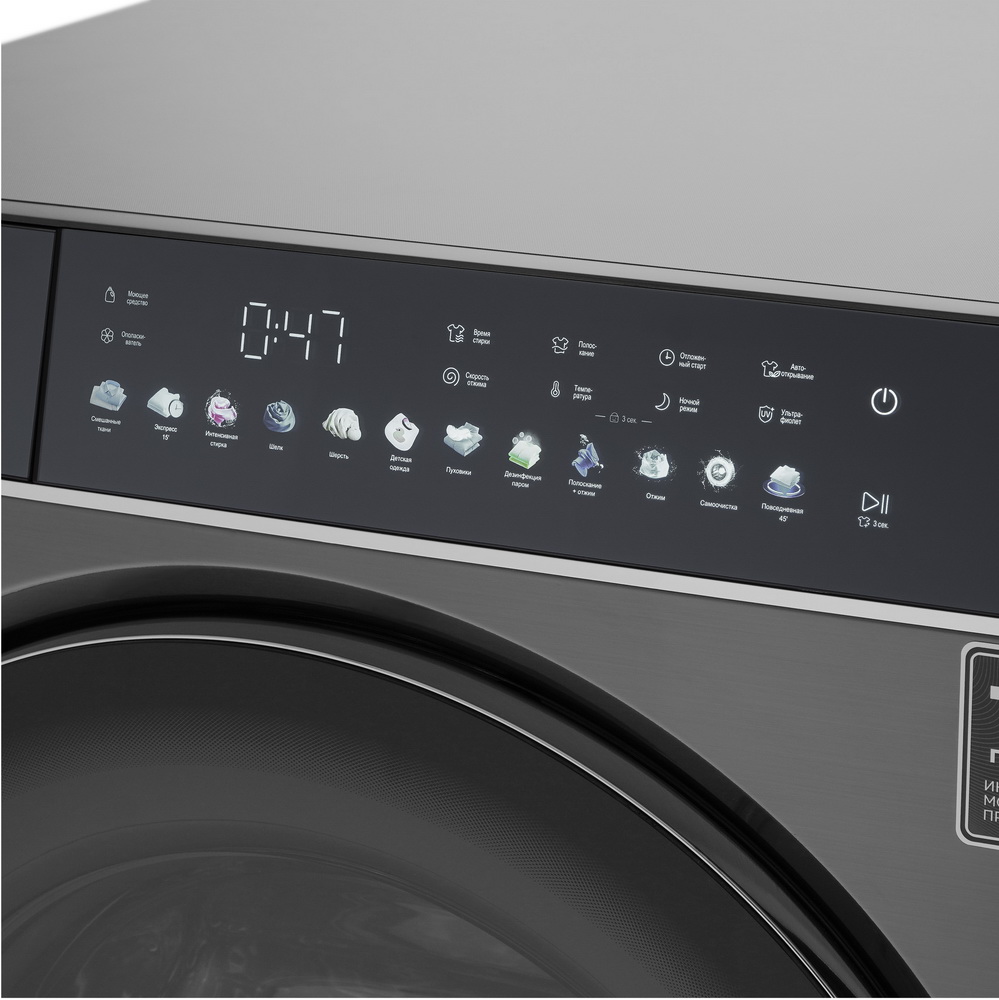 Техника оснащена электронным управлением и LED-дисплеем, который отображает настройки, продолжительность программы и этапы выполнения программы. Это делает использование машины простым и удобным даже для тех, кто ранее не сталкивался с подобной техникой. Особенностью этой модели является наличие 12 режимов стирки, включая стирку с паром, что позволяет выбрать наиболее подходящую программу в зависимости от типа ткани и степени загрязнения. Максимальная загрузка для стирки составляет 10 кг, что делает машину идеальной для больших семей. Скорость отжима варьируется от 400 до 1400 об/мин, что позволяет сохранить форму и цвет одежды даже после многократных стирок.