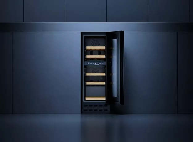 Встраиваемый винный шкаф Kuppersbusch FWKU 1531.0 S — это компактное и стильное решение для хранения вин, разработанное для установки в узкие ниши. Модель выполнена с фасадом из черного стекла: остекленная дверь в черной рамке защищает содержимое от яркого света и позволяет видеть коллекцию. Ручка скрыта в полотне, поэтому фронт остается ровным. Высота корпуса регулируется в пределах 81,5–88,5 см, ширина 29,5 см, глубина 57 см, что позволяет интегрировать шкаф даже в ограниченное пространство. Для установки под столешницу предусмотрена съемная вентиляционная решетка.
