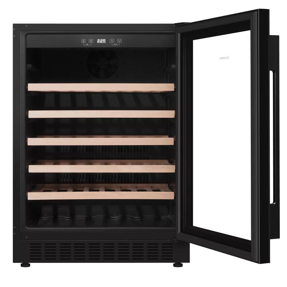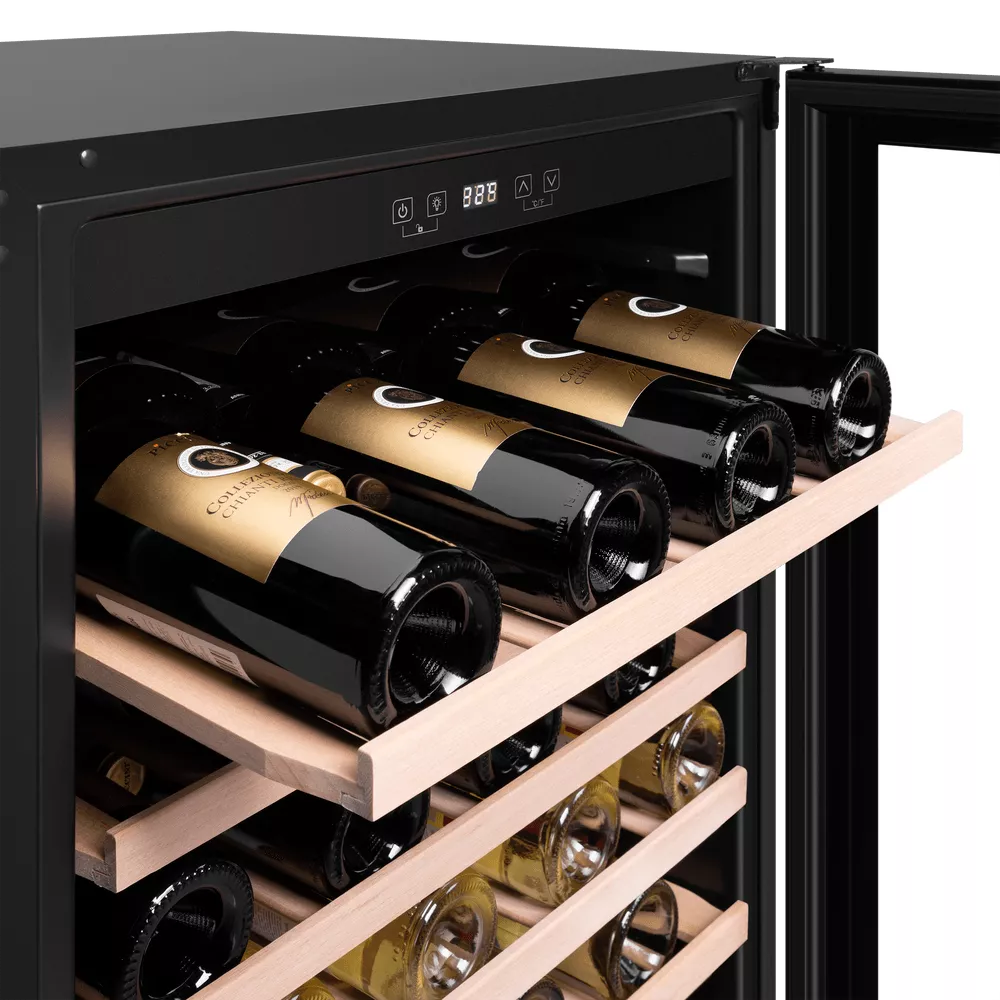 Сенсорное управление с цифровой индикацией температуры обеспечивает простую настройку. Внутри расположены 5 полок из массива бука, снижающих вибрацию и бережно фиксирующих бутылки. Шкаф выполнен в элегантном чёрном цвете и гармонично впишется в любой интерьер.